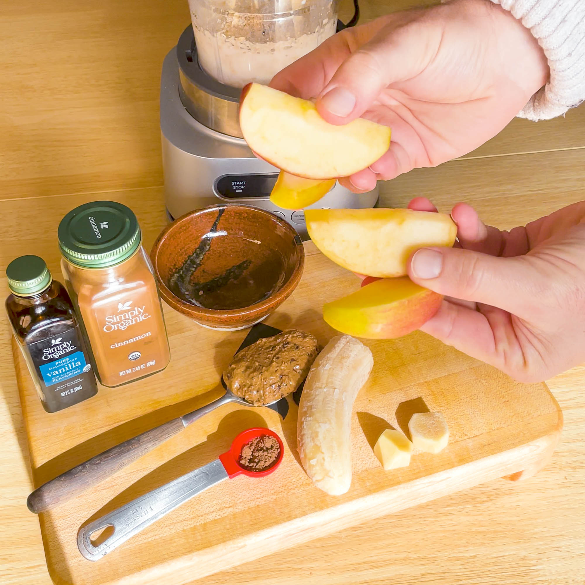 5. Adjust: You may need to add a bit more liquid if using frozen apples. Or add more oats or a 1/4 cup Greek yogurt if you want a thicker, creamier blend.