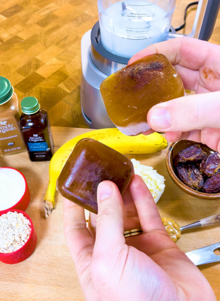 - The Solids: 1 frozen banana, 2 pitted Medjool dates.